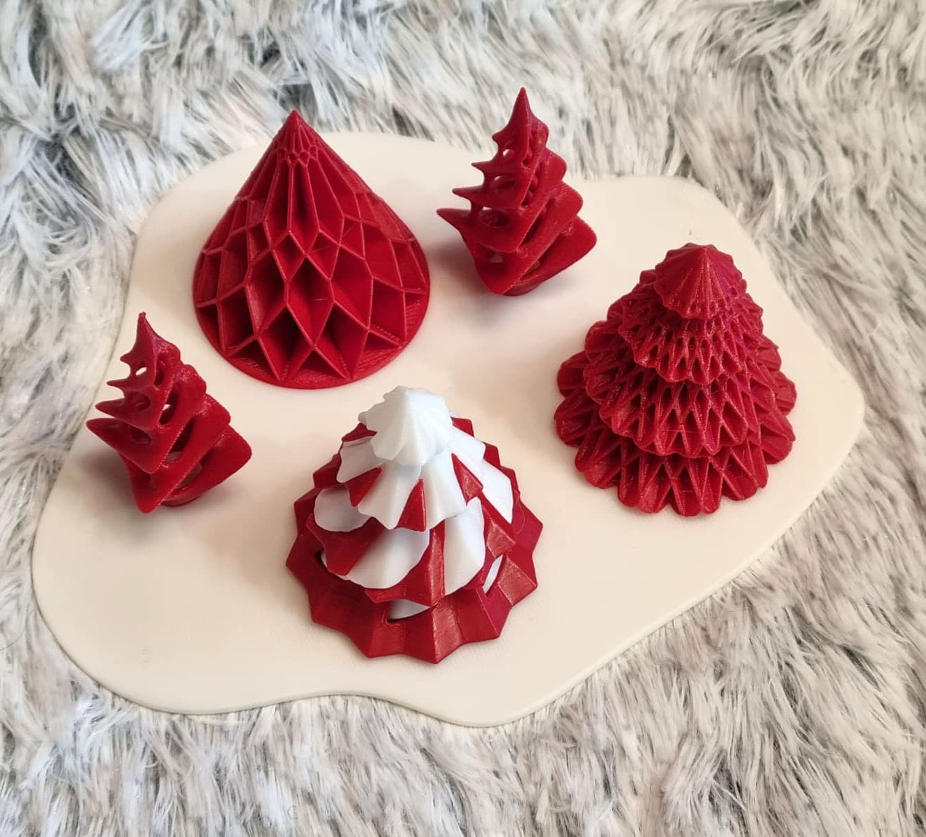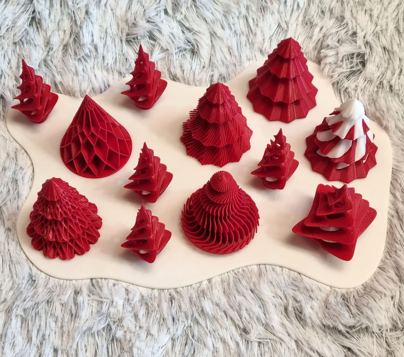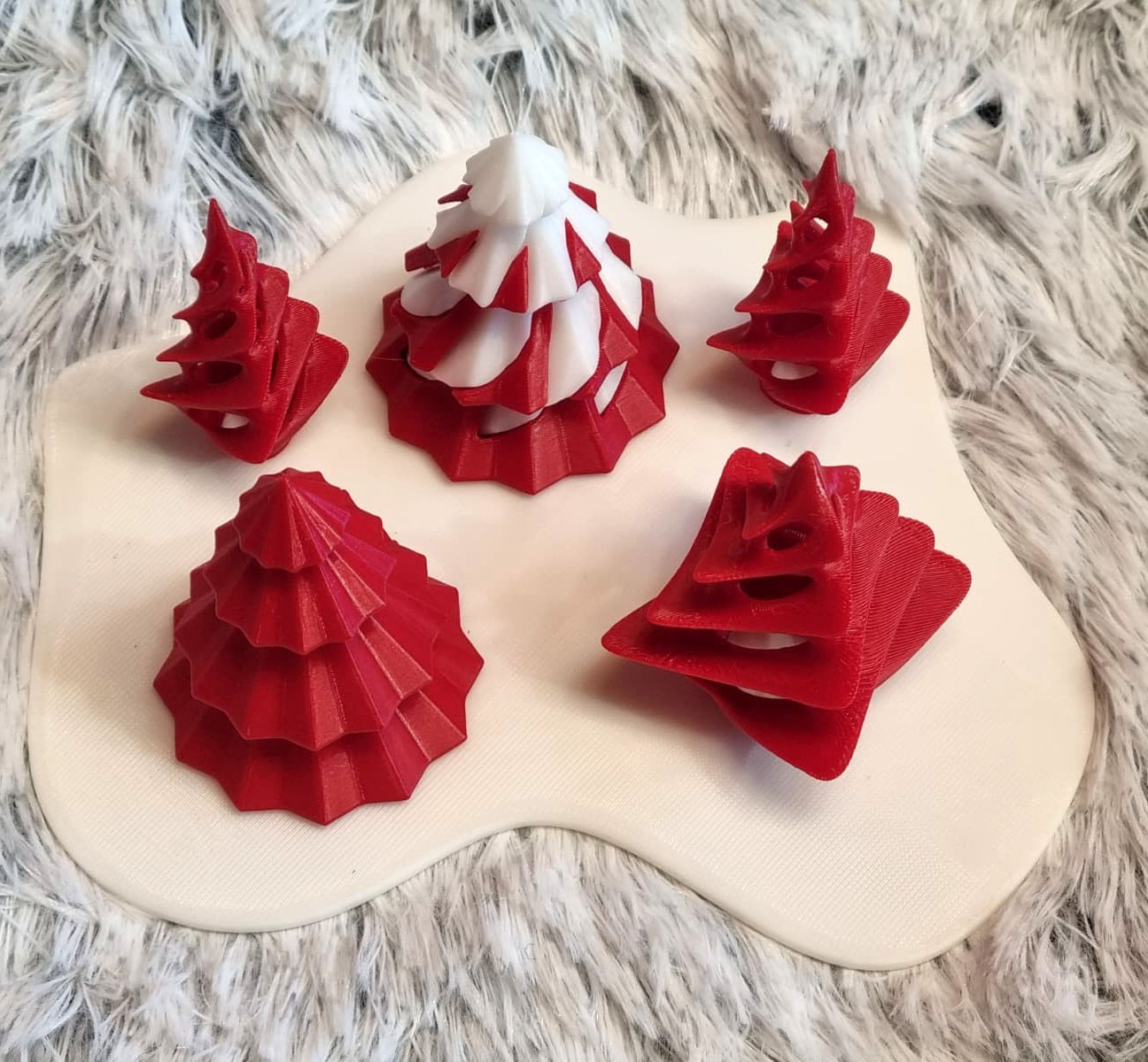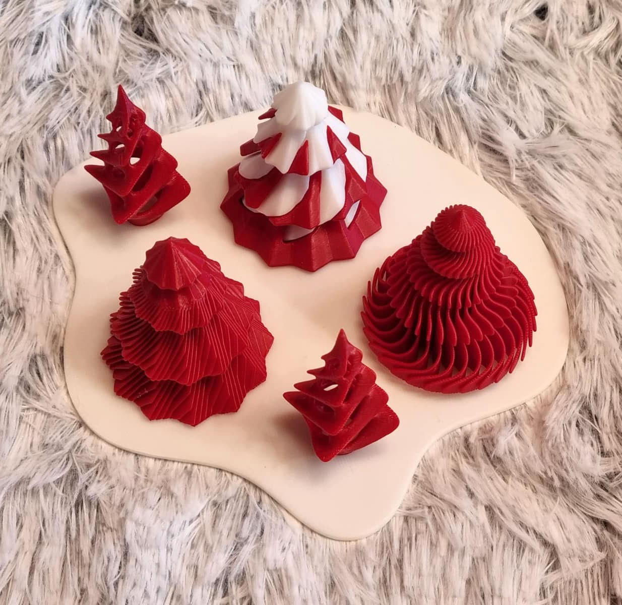 Una decorazione in plastica stampata in 3D con alberi di Natale rossi sulla neve.