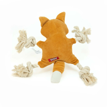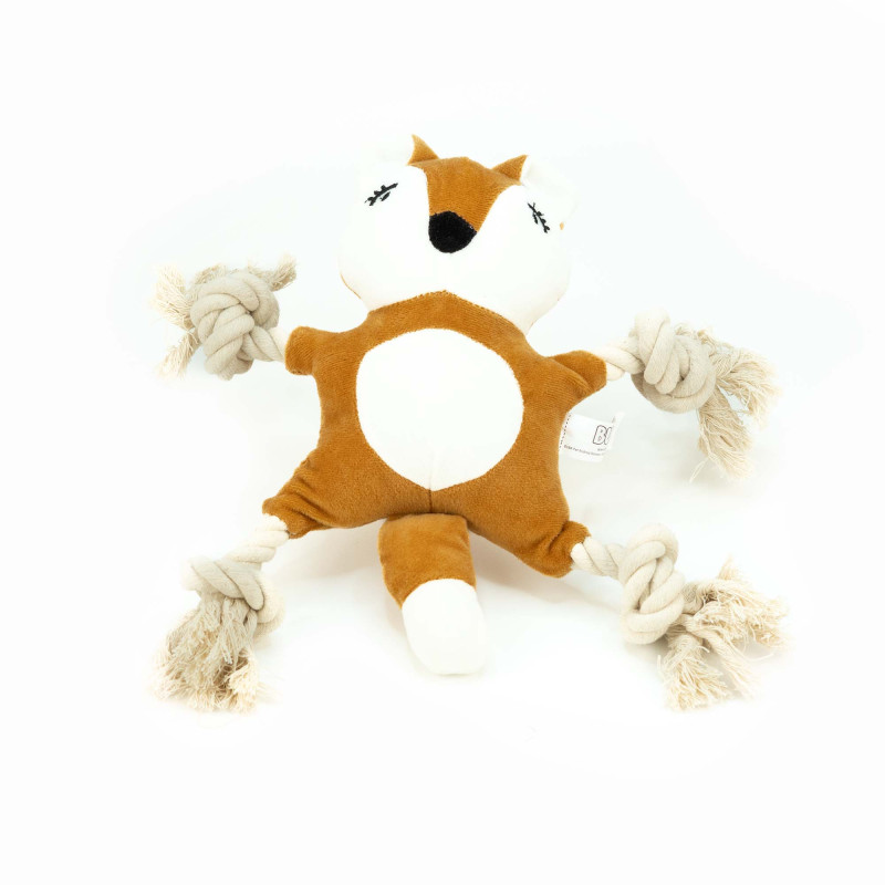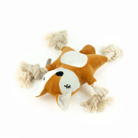 Un giocattolo di peluche a forma di volpe con elementi in corda intrecciata.
