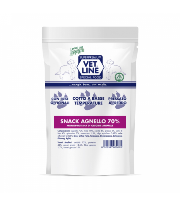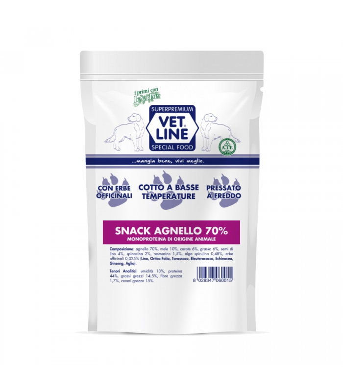 Agnello 70%, mele 10%, carote 6%, grasso 6%, semi di lino 4%, spinacina 2%, rosmarino 1,5%, alga spirulina 0,48%, erbe officinali 0,025% (Lino, Ortica Folia, Tarassaco, Eleuterococco, Echinacea, Ginseng, Aglio).