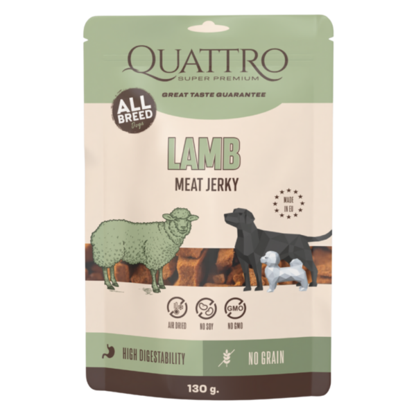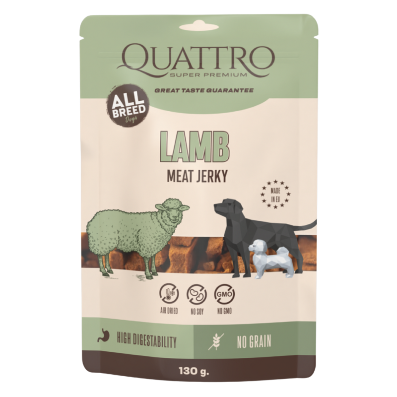 QUATTRO Adult No Grain Lamb Meat Jerky è uno snack carnoso e aromatico, perfetto come ricompensa quotidiana o come premio nei momenti trascorsi insieme al tuo animale domestico.